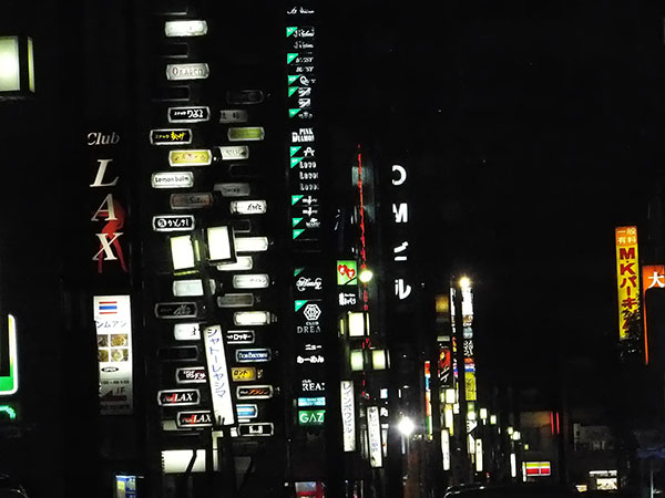 確かに夜になってから女子大小路を歩いてみたが、ネオン看板の数は、前回紹介した錦三に比べ、やや少ない感じだった。